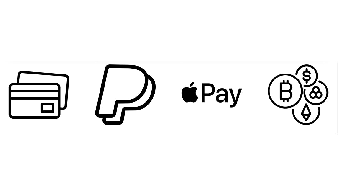 Tarjeta de crédito y débito (VISA, MasterCard, AMEX) PayPal, Apple Pay, Google Pay, Bitcoin, Ether.